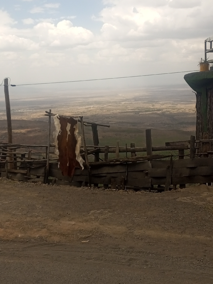 A vista of a dry landscape under a cloudy sky, partially obscured by a weathered, wooden fence. A hide is drying on the fence. An electrical pole stands to the left. A structure with a green roof and vegetation on top is visible on the right. The foreground is a dirt road or ground surface.