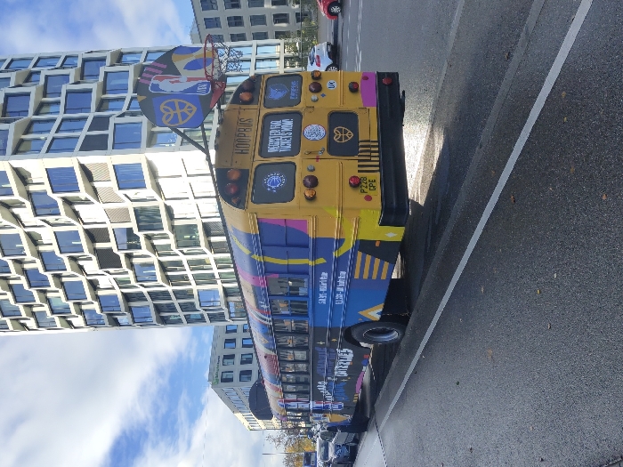 - "An American-style school bus, extensively customized with a multi-colored graphic wrap in yellow, blue, and pink, is parked parallel to the curb on a paved urban street" by FM-8YInA3, licensed under CC BY 4.0