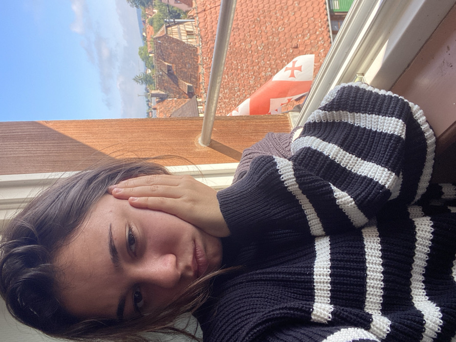 A young individual, appearing female, with dark brown hair, is captured indoors, positioned near an open window or balcony in Bouxwiller, France. The person wears a dark navy blue ribbed knit sweater featuring prominent wide white horizontal stripes across the body and flared cuffs. Their right hand rests against their right cheek/jawline, and their gaze is directed slightly downward with a neutral, introspective expression. Bright sunlight illuminates the right side of the scene, casting a shadow on the interior wall. Beyond a light-colored railing, an extensive view of the city of Bouxwiller is visible under a clear blue sky with scattered clouds. The cityscape primarily consists of buildings with terracotta-tiled roofs, some exhibiting traditional half-timbered architectural elements. Green trees and foliage are interspersed among the structures, and distant hills or mountains are visible on the horizon. A white flag adorned with five red crosses (the flag of Georgia) is partially visible hanging below the railing in the lower right quadrant.