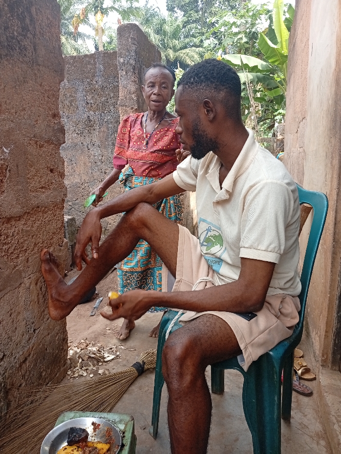 An elderly woman in a patterned dress and coral top stands near a weathered wall, holding a small green item. A younger man with a beard sits on a green chair, holding food. A broom lies on the ground next to a plate of food. The setting appears to be a rural or less developed area, with the structures showing signs of age and disrepair.