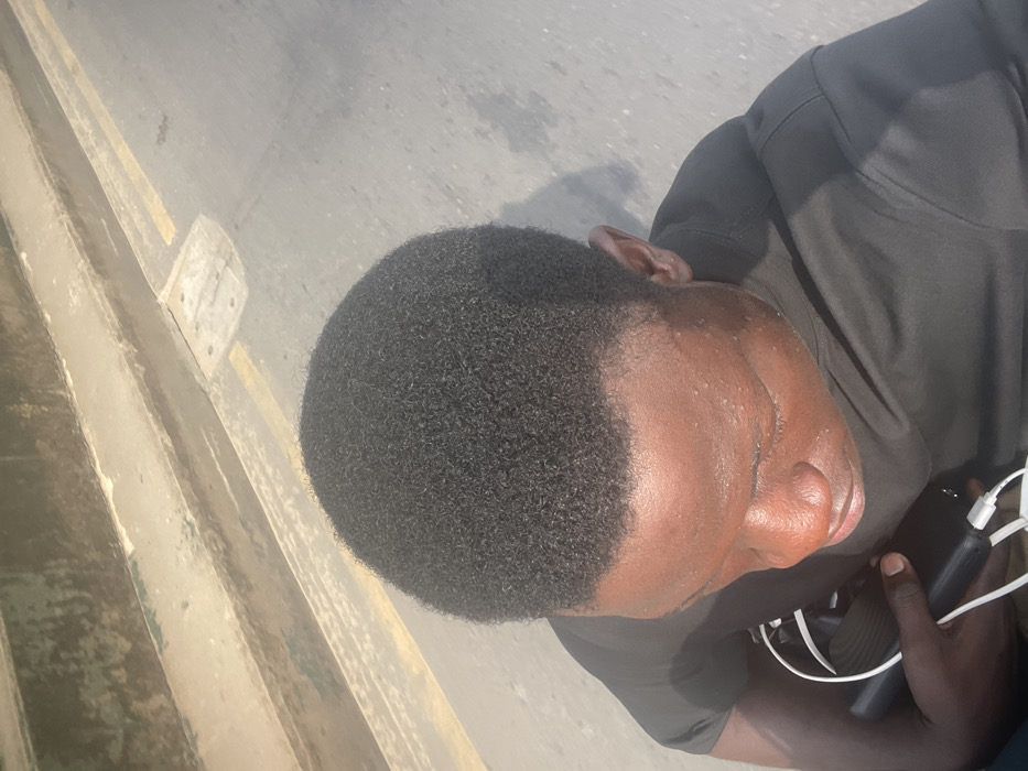 An overhead shot depicts a man with short, dark hair, wearing a black shirt. He's holding a black device with white cords plugged into it. His skin appears sweaty, suggesting a recent physical activity. The background features gray, textured steps or planks with yellow accents, implying an outdoor setting, possibly a set of bleachers or a walkway. The overall composition focuses on the man's head and upper body.