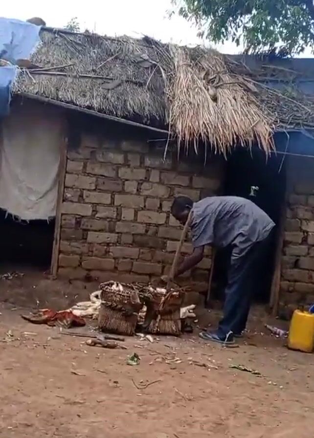 Two people are outside a brick building with a straw and tarp roof. A man is using a stick to tend a fire in a basket, while a woman bends down and appears to be washing something in a blue basin. There is a yellow container next to her. The ground is dirt. There is a tree to the right of the building.