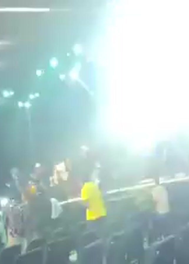 dimly lit event space, likely a concert hall or auditorium, with a stage occupied by a musical band performing. Numerous people are milling around the seating area in front of the stage, some standing and watching the performance. The stage is illuminated by spotlights, and there are speakers and other stage equipment visible. Some audience members are dressed casually, while others are wearing more formal attire. The environment is energetic with lights flashing, stage smoke, and sounds from the band. The camera appears to be hand-held, resulting in some shakiness in the footage.