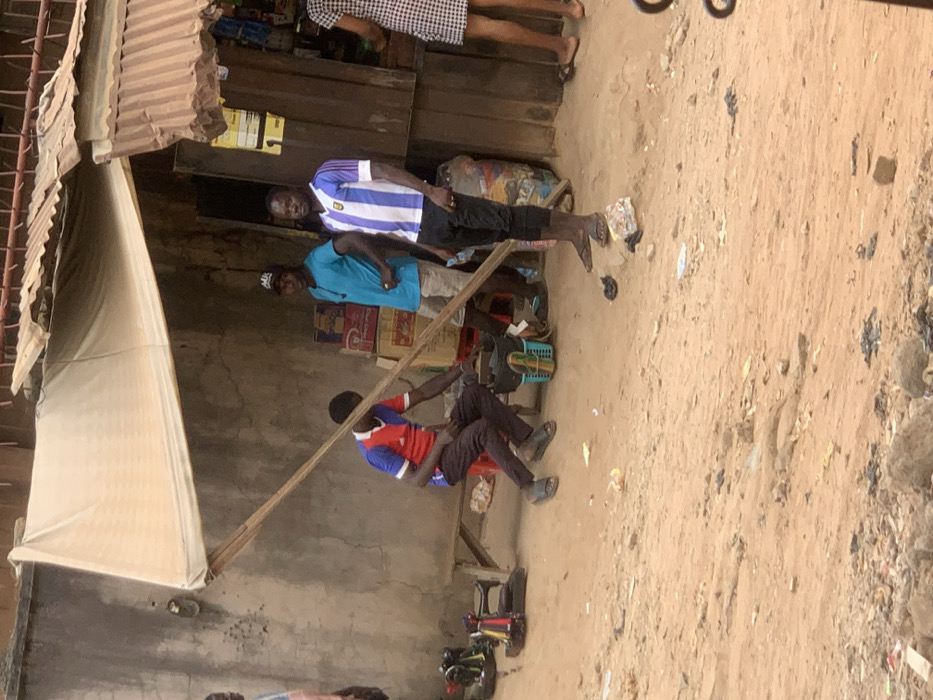 Three men are seen outside a small store or building. The store has a corrugated metal roof and a canvas awning. Two men stand in front of the store, while the third is seated, propped up by a wooden pole. The surrounding ground is dirt, with scattered debris. The overall scene suggests a casual, informal setting, likely in a less developed area.
