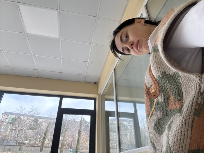 A woman is depicted from a low-angle perspective, positioned in the upper right quadrant of the frame, looking downwards directly towards the camera. She has dark hair, styled loosely, and is wearing a light-colored collared shirt under a chunky knit cardigan. The cardigan features a textural pattern in beige, olive green, and terracotta hues, with raised yellow/gold elements. A small stud earring is visible in her right ear. The background reveals an indoor setting with a white suspended ceiling comprising square acoustic tiles, one of which is a rectangular light panel. Below the ceiling, a light yellow-beige wall fascia runs horizontally. Below this, a series of large windows with dark frames occupy the majority of the background, offering a view of an urban environment. A small black security camera is mounted in the top right corner of the room, near the ceiling and window frame. Through the windows, a grey, overcast sky is visible. The exterior scene shows numerous bare deciduous trees, indicating a winter or early spring season. In the mid-ground, several multi-story residential buildings, consistent with apartment blocks, are visible, contributing to an urban landscape. A dark fence or wall runs along the immediate outdoor foreground. The general architectural style and urban density are characteristic of a residential area within the city of Tbilisi, Georgia. No specific landmarks are visible to pinpoint a precise location or address within Tbilisi.