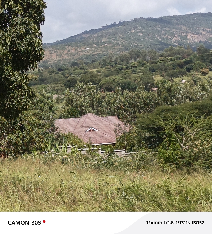 A landscape captures a house with a brown tiled roof partially obscured by trees and vegetation. A low stone wall surrounds the property. In the background, a rolling mountain covered in green vegetation is visible under a cloudy sky. Tall grass and various plants fill the foreground, adding depth to the scene. The image appears to have been taken from a slightly elevated position.