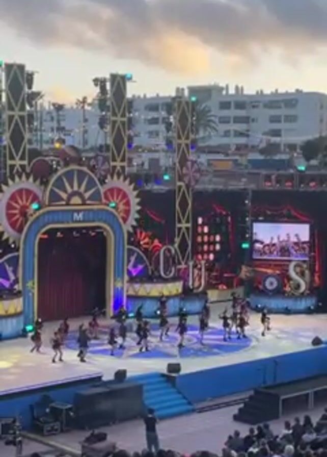 large outdoor stage with a show in progress. There are numerous performers on stage, dressed in matching costumes, engaged in a choreographed dance routine. The stage is elaborately decorated with elements that suggest a circus or theatrical theme. In the foreground, an audience fills the seating area, watching the performance. Buildings and trees are visible in the background beyond the audience. The sky above is a clear blue with scattered clouds. The camera pans slightly upward, capturing the overall scene from an elevated position.