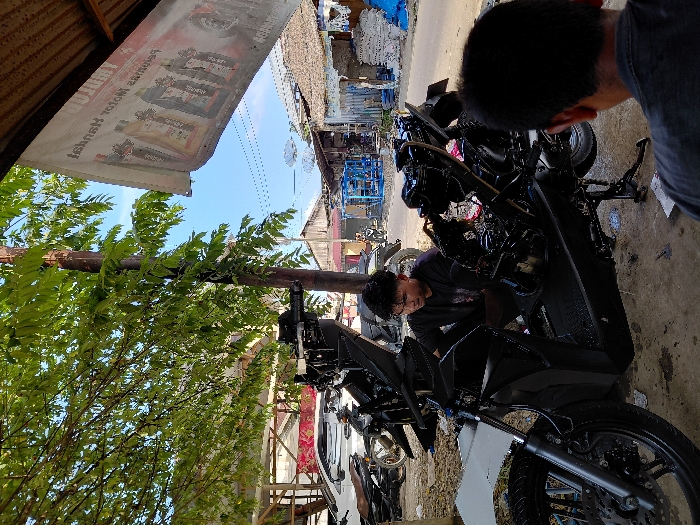 Two people are working on a black motorcycle. One person, wearing glasses and a dark long-sleeved shirt, is focused on the engine area. Another person, wearing a gray shirt, is standing and watching. The motorcycle is on a stand in an outdoor setting. A banner with motor oil advertisements hangs above. A tree with green leaves is visible on the left side of the image. Other motorcycles and buildings can be seen in the background.