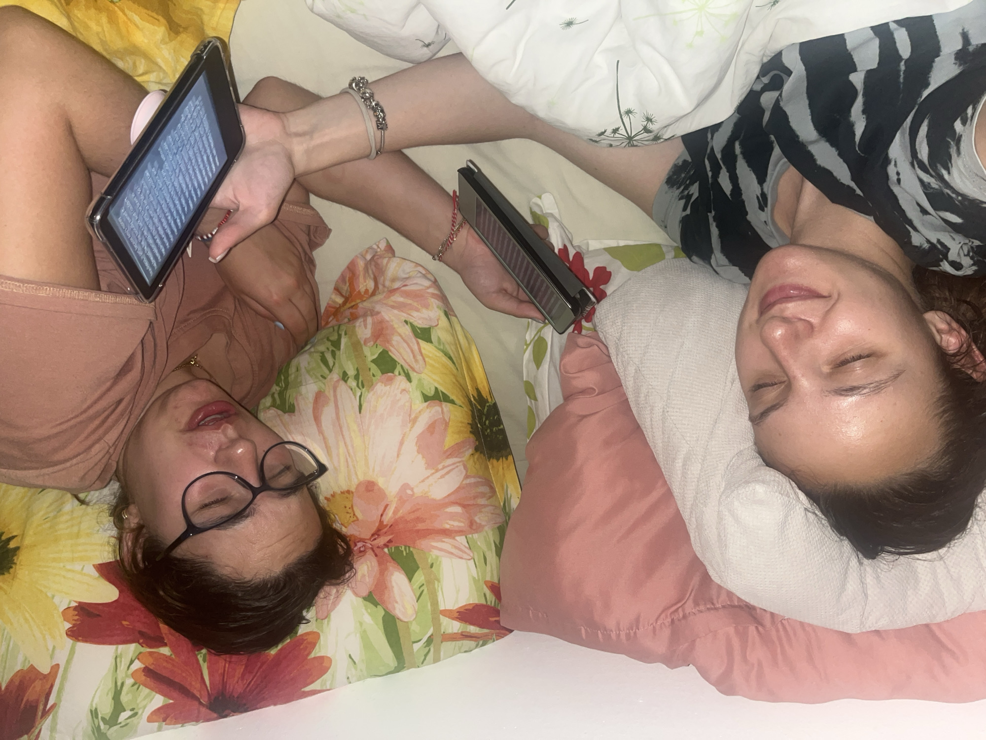 - "Two individuals are lying in bed, side-by-side, each reading on an electronic device" by FM-0EuNd2, licensed under CC BY 4.0
