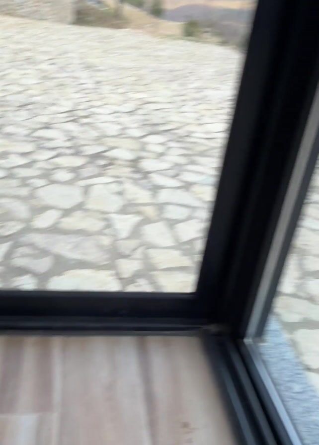 The video starts with a close-up shot of a white plate and a silver spoon on a dark brown surface. The camera then pans to an outdoor view through a large window. Two people are visible outside the window: one in a gray hooded jacket and jeans, and another in a black jacket with a backpack. The person in the black jacket is holding a phone. The landscape features mountains, a lake, trees, and a paved stone pathway. The sky is blue with scattered clouds.
