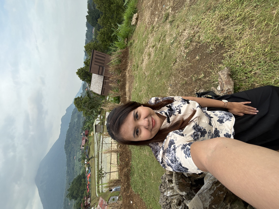 An adult female is depicted in a selfie, positioned in the foreground on an overcast day in Selotapak, Indonesia
