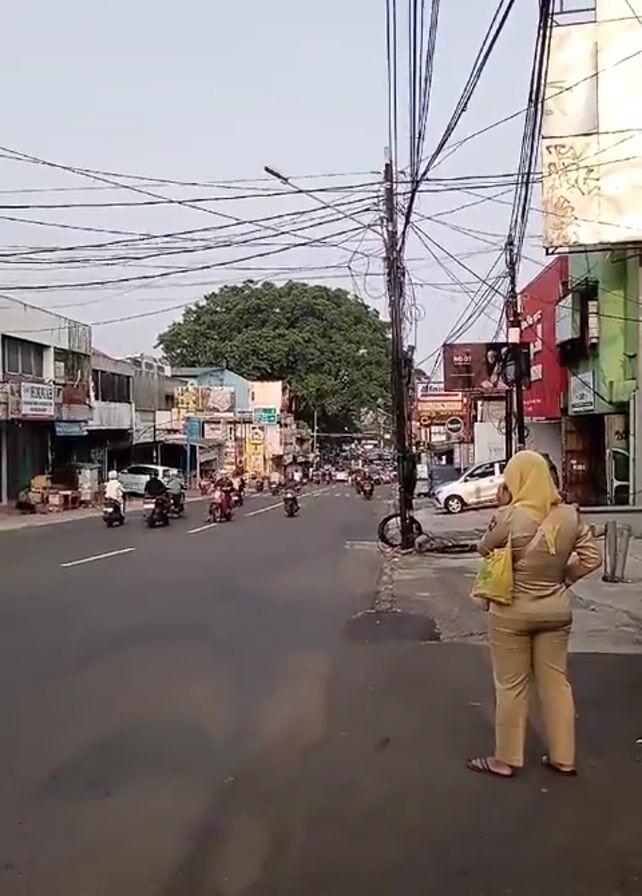 street scene in what appears to be an Asian city or town. A woman wearing a hijab and light brown or beige pantsuit stands on the sidewalk near a utility pole cluttered with wires. She carries a light-colored tote bag. The street is lined with two-story buildings housing various shops and businesses. Motorbikes and a few cars are visible in the street, moving in both directions. The sky is overcast. A large tree is visible at the end of the street.