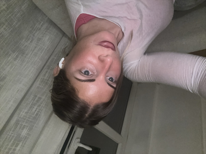 A female individual is depicted in a medium-close-up selfie, taken indoors in Paris, France. She has brown hair and blue/grey eyes, with defined eyebrows and dark lipstick. She is wearing a white long-sleeved top over a visible reddish undershirt. A white wireless earbud is present in her right ear. The subject is positioned on a light-colored upholstered surface, likely a sofa or armchair. In the background, a white window frame with a standard European-style handle is partially visible, flanked by light-colored, textured curtains. The lighting appears to be from an unseen internal source.
