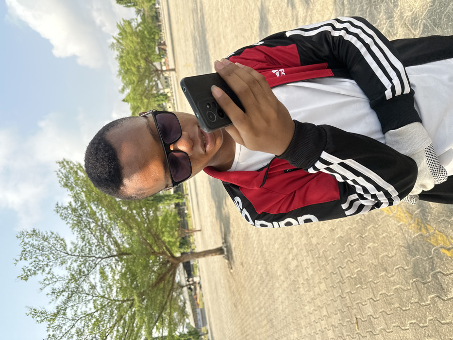 A single individual stands outdoors in Ozuaha, Nigeria, positioned on a light-colored paved surface composed of interlocking blocks. The person, appearing male with short dark hair and a dark skin tone, wears dark-framed sunglasses, a red, black, and white Adidas track jacket with the brand logo visible, and a white t-shirt. They are actively holding a black smartphone in their right hand, oriented towards themselves, and looking down at its screen. The background features a sparse arrangement of green-leafed trees under a clear blue sky with scattered white clouds. No other individuals are present in the frame.