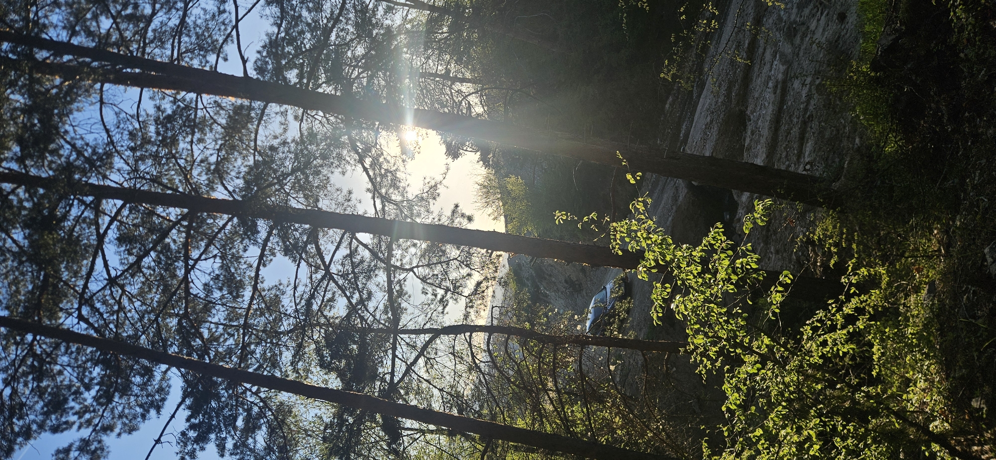 The image depicts a wooded area, likely located in or near Kostenets, Bulgaria, given the prompt's request. The sun is visible through the trees, causing lens flare. The trees are mostly bare except for a few new buds. In the distance, a vehicle can be seen. To the right is a rock wall.