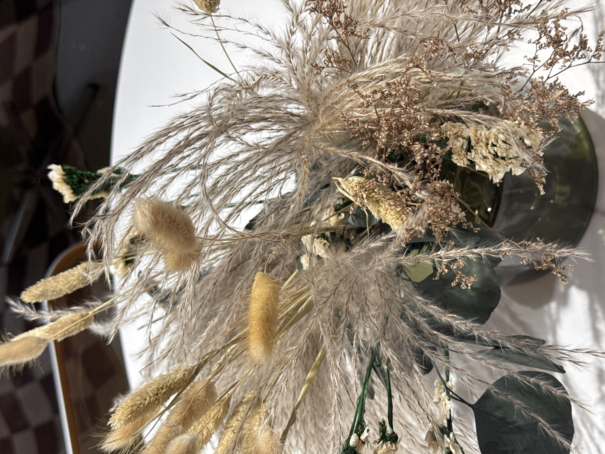 close-up of a dried floral arrangement in a vase. The arrangement includes pampas grass, bunny tails, eucalyptus leaves, and other dried flowers. The vase is sitting on a white surface. The background is blurred, but appears to be a room with a brown and white checkered floor. The location in the city of Azov, Russia is not possible to determine from the image.
