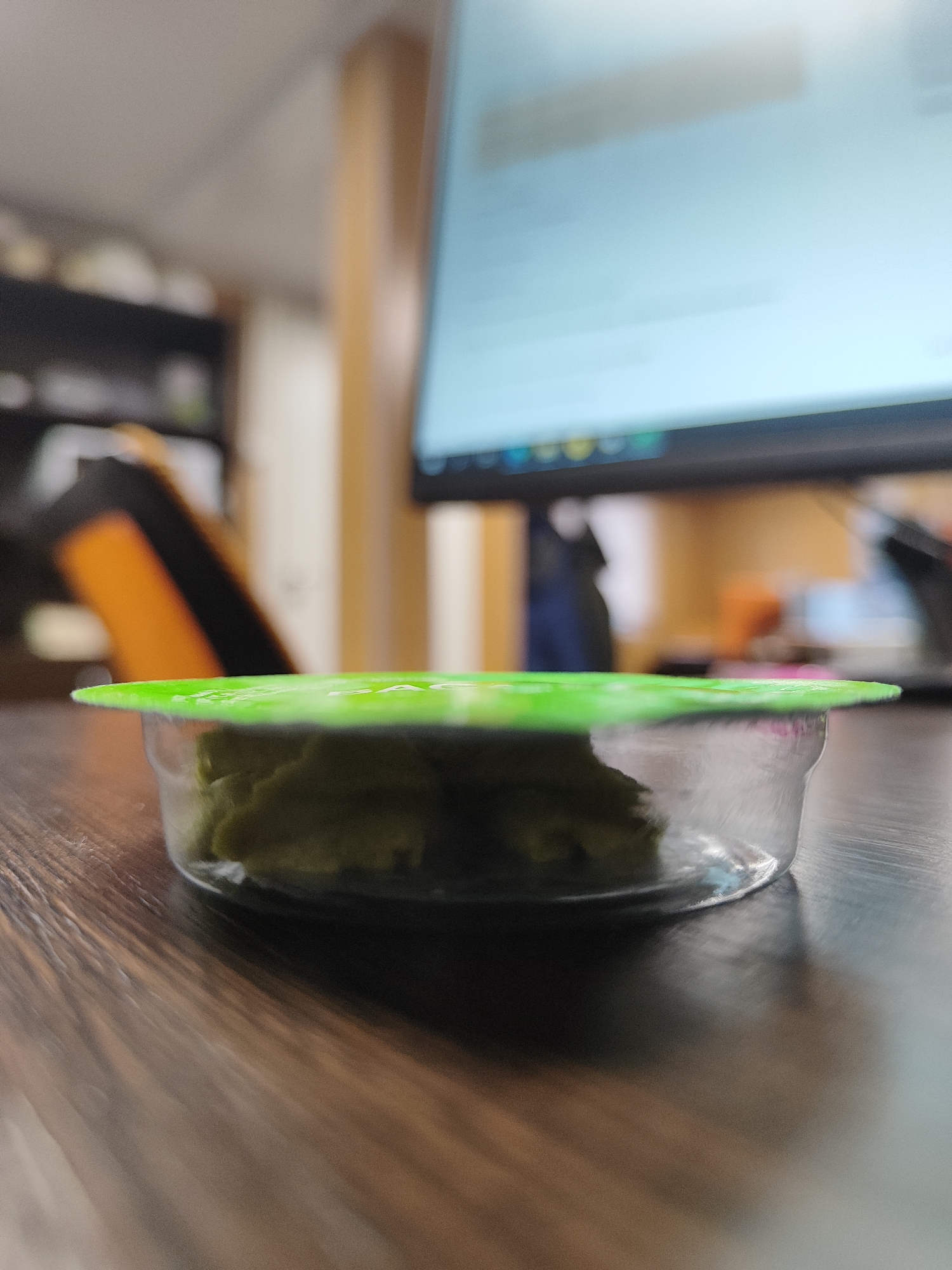 On a wood-patterned surface, a clear plastic container with a green lid rests. Inside the container is a dark green substance, possibly food. The background is out of focus, but it appears to be an office environment with a computer monitor, desk, chair, and shelving visible.