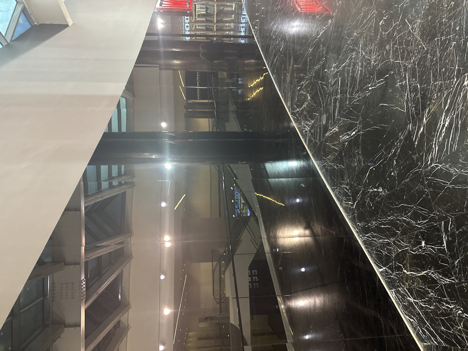 interior of a modern building, possibly a shopping mall or office complex, in Moskva, Russia (latitude: 55.872, longitude: 37.471). The scene is captured from a perspective looking down a long, narrow corridor with a black marble floor. White veins run throughout the black marble, creating a striking contrast. Two large black pillars, one on the left and one on the right, dominate the space. The floor reflects the overhead lighting, creating a mirror-like effect. The far end of the corridor appears to be empty with a glimpse of a glass railing.