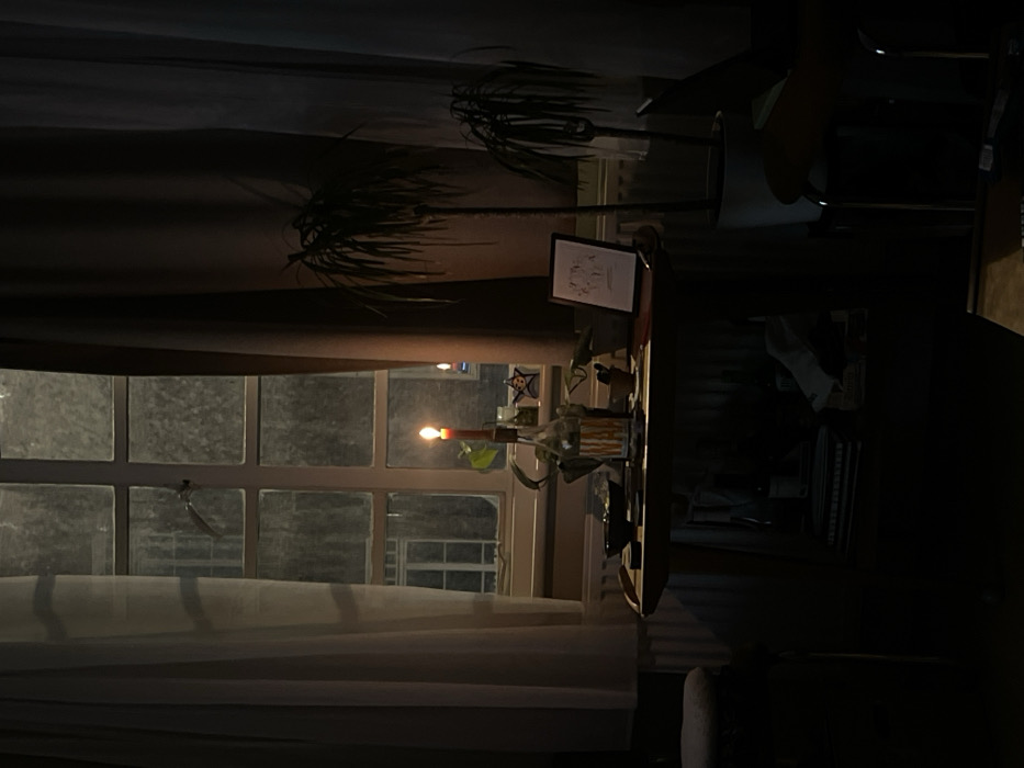 A dimly lit room features a window covered with sheer curtains, through which an exterior scene is visible. A table sits in front of the window, adorned with a burning candle and what appears to be a botanical arrangement within a glass container. A framed picture or document is positioned on the table. To the right, a chair is partially visible, merging into the shadowed background. A potted plant stands atop the table, with its silhouette extending towards the ceiling.