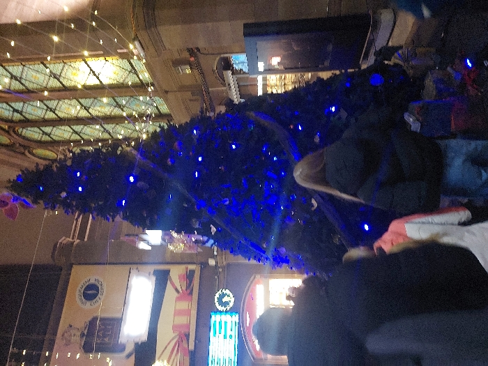 A tilted indoor shot features a large Christmas tree adorned with blue lights, positioned next to advertising posters