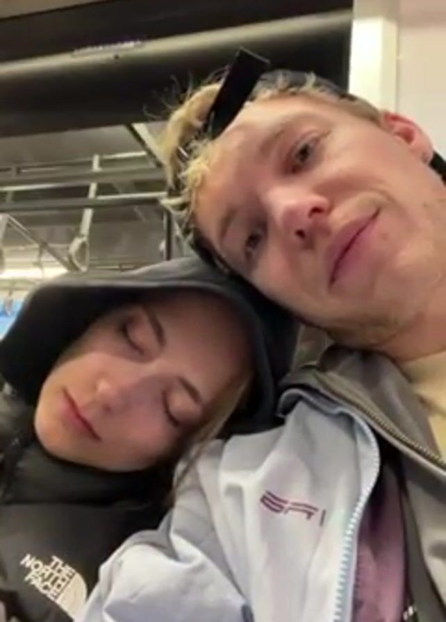 A young man and woman are seated next to each other on public transportation, likely a train, as the sound of an announcement is audible. The woman is asleep, her head resting against the man's shoulder. The man is awake and looking into the camera. The woman is wearing a black hooded North Face jacket. The man is wearing a black cap, a gray jacket and another jacket underneath.