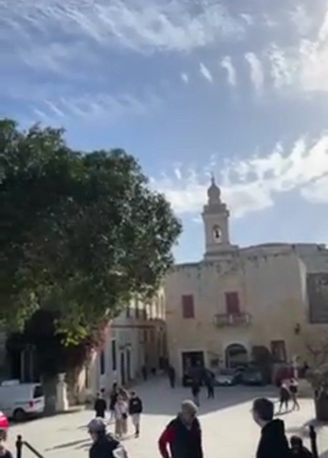 The video begins with a wide shot of a sunny outdoor plaza. The sky is blue with scattered clouds. In the background is a stone building with a bell tower, and a large tree on the left. People are walking around the plaza. The camera pans to the left, revealing a group of people standing at a stone wall overlooking a wide, green landscape. Some of the people are taking pictures with their phones. The sky remains a prominent feature of the shot.