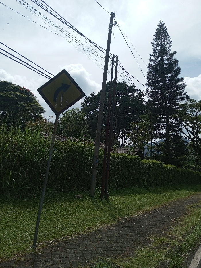 This image presents an outdoor, daylight scene in the city of Namthoung, Laos, characterized by natural vegetation, urban infrastructure, and a paved pathway under a partially cloudy sky. In the immediate foreground, a weathered, diamond-shaped yellow road sign with a black border and a black arrow indicating a sharp right turn is prominently positioned on the left. The sign exhibits dark streaks and wear, suggesting exposure to the elements. It is mounted on a slender, grey metal pole that leans slightly to the viewer's left. To the right of the sign, a section of a dark grey paved path, composed of interlocking pavers, extends diagonally from the bottom right corner, curving slightly left into the midground. Green grass and unkempt vegetation line the path and occupy the immediate foreground. In the midground, two utility poles stand vertically. The left pole is dark grey and thicker, supporting multiple black overhead power lines that stretch horizontally across the upper frame. The right pole is thinner and reddish-brown, also supporting wires. Behind the path and poles, a dense, overgrown hedge or wall of dark green foliage extends horizontally across the scene. Above this foliage, the reddish-brown tiled roofs of one or more structures are partially visible. The background consists of a dense treeline dominated by various green trees. A tall, slender, dark green conifer tree stands prominently on the right side of the frame, towering above other foliage. The sky above is partially obscured by white and grey clouds, indicating daylight conditions. No individuals or animals are visible within the frame.