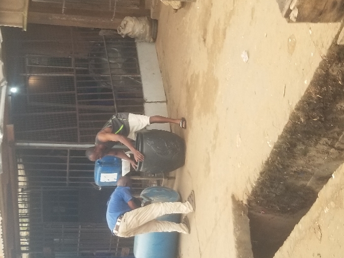 The scene is an outdoor area in Obosi, Nigeria. Two adult males are visible, engaged with large plastic containers. The man on the left wears a blue polo shirt, light-colored trousers, and sandals; he is bent over a blue plastic barrel. The man on the right, dressed in a dark sleeveless vest, white shorts, and dark sandals, is also bent over, with his hands inside a large, dark-colored plastic drum featuring embossed patterns. A blue plastic jerrycan rests on a raised surface behind the first man, near another blue barrel. The immediate foreground contains an open concrete drainage channel with moss-covered walls, partially covered by a concrete slab on the left. The ground is composed of light-colored dirt or concrete, scattered with minor debris. The background shows a building structure with dark metal security grates, an awning, and a visible hanging light fixture. A large, light-colored sack is positioned on the far right.
