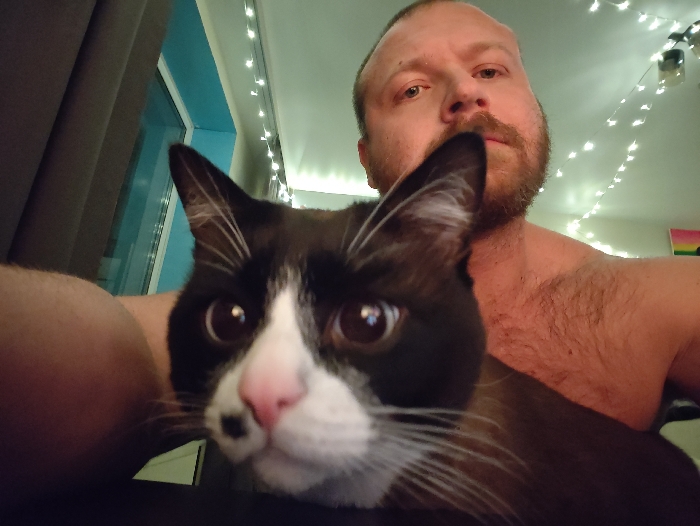 - "A selfie captures a man with a light beard and fair skin, shirtless, with a black-and-white cat prominently in the foreground" by FM-eMutn2, licensed under CC BY 4.0