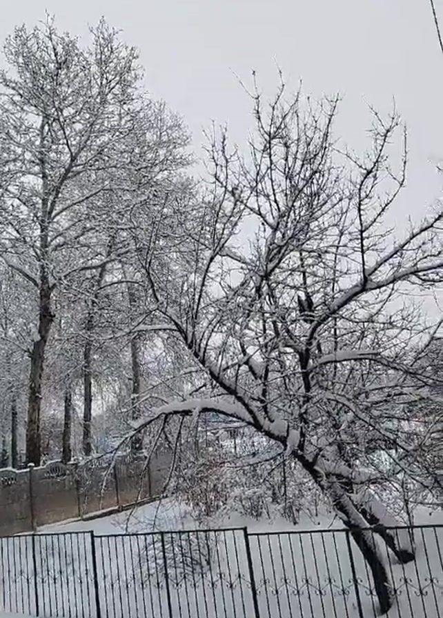 The scene is a snow-covered landscape on a cloudy day. Tall trees with bare branches, coated in snow, stand behind a gray concrete wall and a black metal fence. The ground is entirely covered in snow. A building is visible in the upper right corner. There are no people visible in the video.