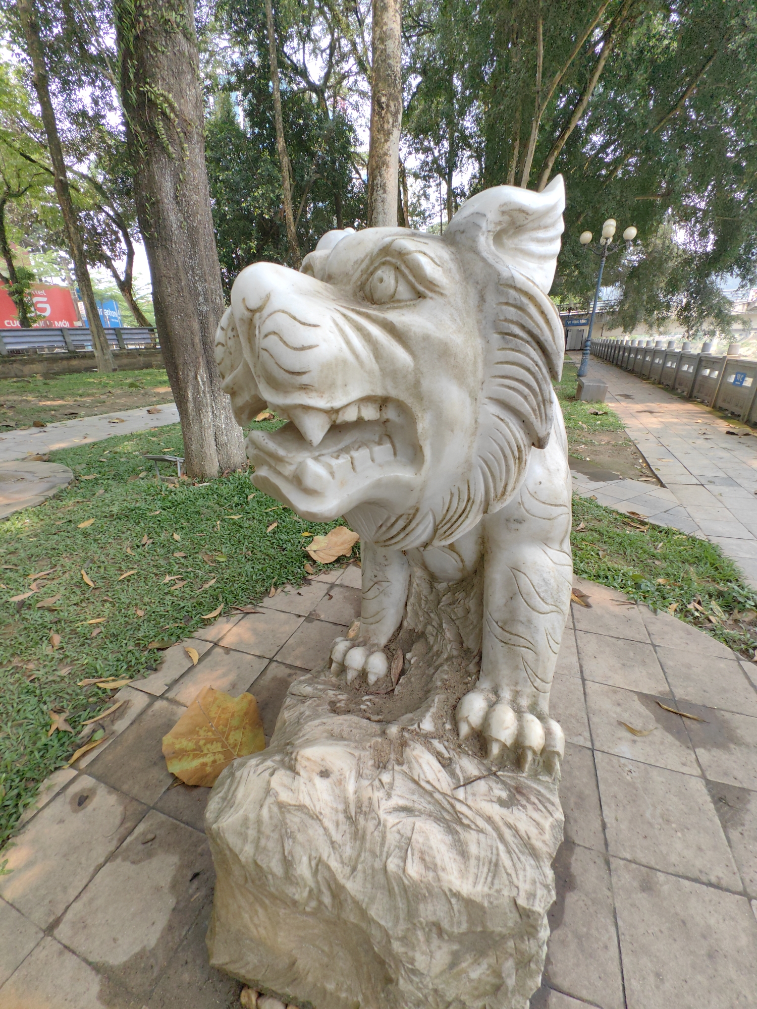 Captured outdoors in Thành phố Hà Giang, Vietnam, the image focuses on a white marble statue of a lion-like creature, mouth agape in a roar, perched atop a stone base. The statue sits on a paved walkway. Behind it, grass and fallen leaves cover the ground, with a tree trunk nearby. In the background, trees line the area, partially obscuring a bridge-like structure and a lamppost. A glimpse of a red banner is visible.