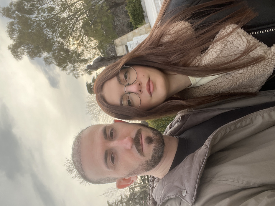The image displays a selfie of two individuals, an adult male and an adult female, situated outdoors in a park or public square in Xanthi, Greece