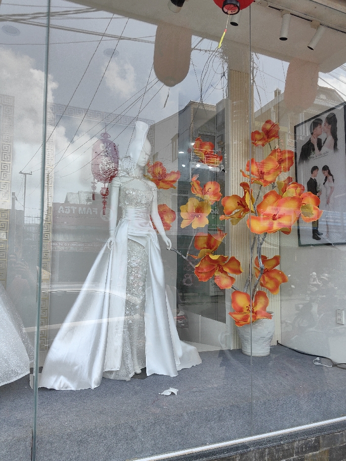The image depicts a storefront window display, located in Vỹ Dạ Ward, Vietnam. The scene is observed through clear glass, which reflects the exterior environment. **Inside the Display:** A central, white, full-body female mannequin is positioned, wearing an elaborate, floor-length white wedding gown. The gown features a high-necked, heavily embellished bodice, a flowing satin overskirt that opens in the front, and a fitted, glittery lace underskirt. A tall, sculptural white headpiece adorns the mannequin's head. To the left, a portion of another white, possibly glitter-embellished, gown is visible. To the right of the central mannequin, a large artificial floral arrangement of vibrant orange and yellow flowers, resembling orchids, stands in a textured white vase. The display floor is covered with a dark grey carpet. On the far right wall within the display, a large framed poster or photograph features two wedding portraits: one showing a couple kissing, and another below it depicting a standing couple. Recessed spotlights are visible on the display's ceiling. A white electrical outlet is present on the right wall, and small pieces of white debris are scattered on the carpet near the central mannequin's feet. **Reflected Exterior Environment (Vỹ Dạ Ward):** Reflected on the glass are elements of a busy urban street scene in Vỹ Dạ Ward. A partly cloudy sky is visible at the top. Numerous overhead electrical or communication wires crisscross the frame. Reflections of buildings across the street include one with a distinct key-pattern or meander-pattern border on its facade, and another with text, appearing as "FẠM TRÀ" (possibly reversed), indicating a business sign. A red decorative lantern with yellow accents is also reflected. A utility pole is visible in the reflection on the far left. The overall reflection suggests a typical streetscape in a Vietnamese city.