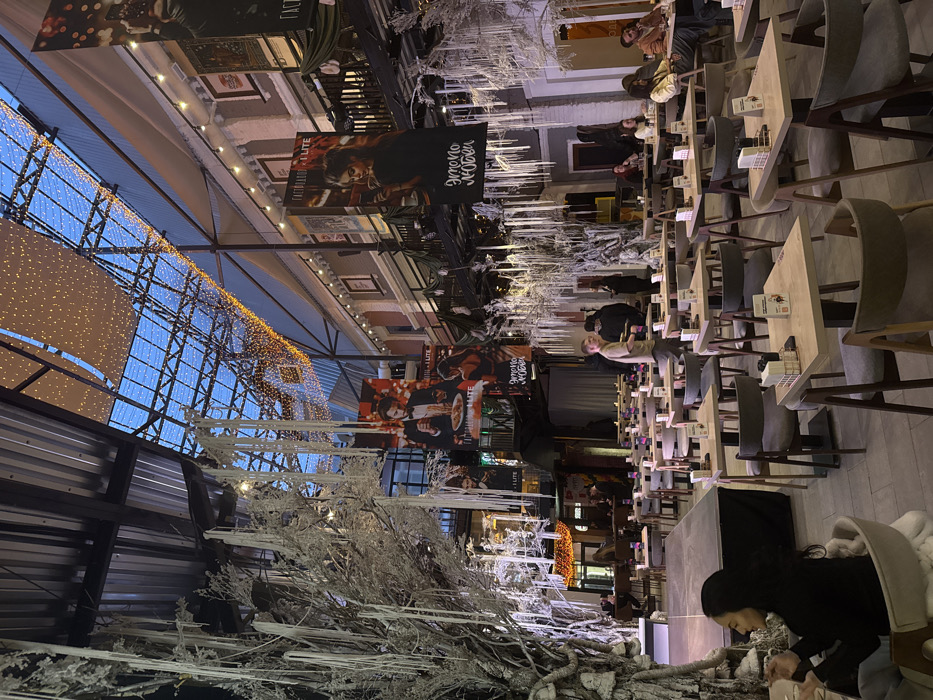 The scene depicts an interior view of a multi-level covered galleria or atrium, likely within the "Manege" shopping and entertainment complex in Saratov, Russia. The environment is lit primarily by artificial means, suggesting evening or night, with a dark blue sky visible through a high glass and metal-framed roof adorned with numerous string lights. The main floor is configured as a restaurant or cafe, featuring dozens of light-colored square and rectangular tables, each set with a paper menu holder and condiment shakers. The tables are surrounded by grey fabric-upholstered chairs with dark wooden frames. Decorative elements include numerous artificial trees and structures heavily draped with white, ribbon-like material resembling snow or large icicles, which also hang from overhead beams. Large vertical banners, displaying images of individuals (a man with spaghetti, a woman with a phone) and text "ГАСТРОВИДОР LITE" and "ЭТО ПО ЛЮБВИ" in Russian, are suspended from upper levels. Approximately 15-20 individuals are present. In the left foreground, a young adult female with dark hair, wearing a dark long-sleeved top, is seated in a light-colored armchair, smiling and looking to her left, with her hands near a cup. In the midground, a male staff member in a light-colored shirt and dark apron walks rightward, carrying a dark tray. Other patrons are seated at various tables throughout the midground and background, engaging in dining and conversation. The upper levels display architectural facades resembling building exteriors.