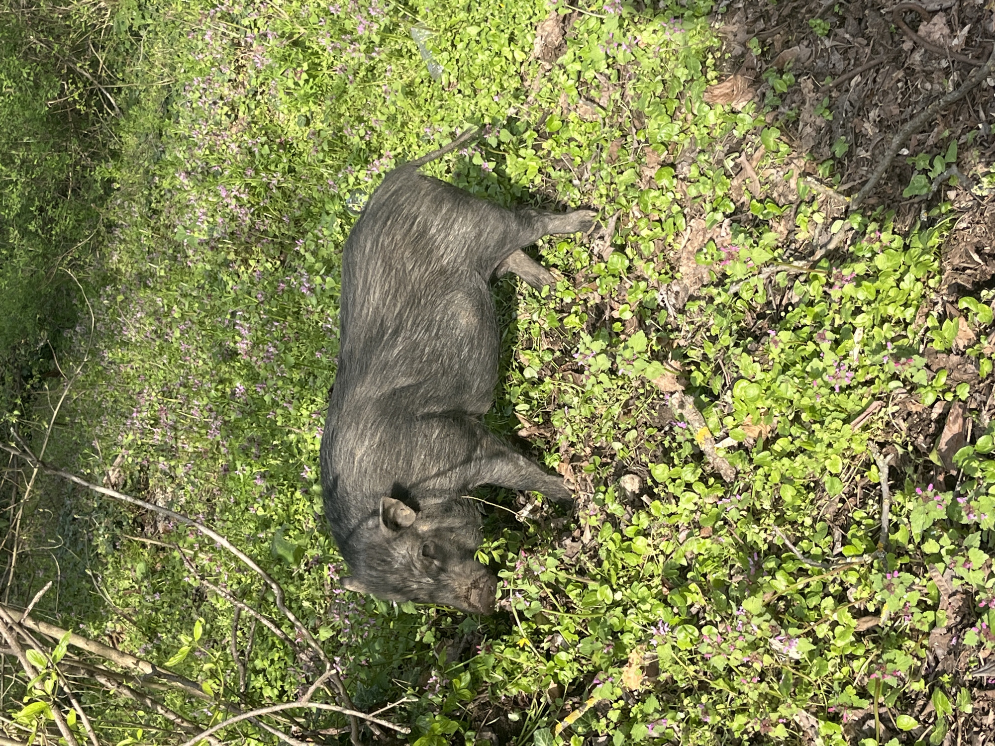 - "single wild boar lying on the ground covered with green vegetation and some purple flowers" by FM-lrmxm1, licensed under CC BY 4.0