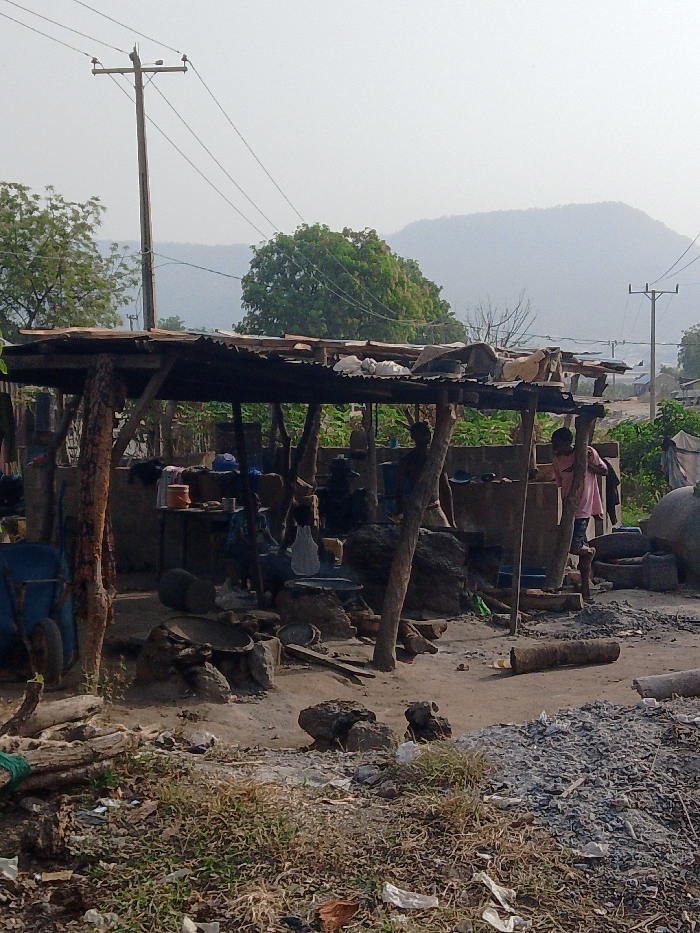 The image depicts an informal outdoor workspace or market stall located in Adankolo, Nigeria