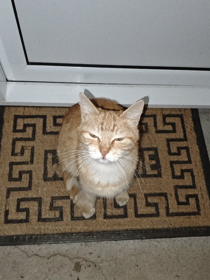 - "A domestic short-haired cat, primarily orange with white markings on its chest, snout, and paws, is depicted sitting upright on a brown doormat" by FM-KitLQ2, licensed under CC BY 4.0