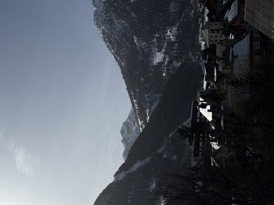 The image presents an elevated view of the city of La Salle-les-Alpes, France, under winter conditions. The upper third of the frame is occupied by a bright, hazy, light blue sky with a prominent light source in the upper-left quadrant. The background features rugged, snow-covered mountains. A steep, forested mountain with visible cleared ski runs or paths dominates the left side, while another heavily forested mountain with snow dusting rises on the right. A distinct, snow-capped rocky peak is centered in the mid-distance between the primary mountain ranges. The mid-ground and foreground depict a section of the La Salle-les-Alpes village. Numerous structures are visible, including multi-story buildings with various roof types, many of which are covered in snow. A rectangular, multi-story building is prominent in the mid-left, partially obscured by bare deciduous trees and evergreen trees. The foreground is heavily shadowed by a dense canopy of bare trees and other vegetation, obscuring ground details. The lighting creates strong contrast, with bright sunlight illuminating the sky and upper mountain areas, while the village and lower slopes remain largely in deep shadow. No individuals or active subjects are discernible within the scene.