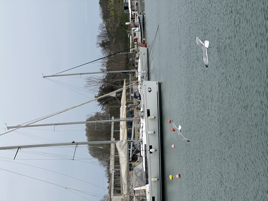 The image captures a harbor scene in Limenas Avdiron, Greece, under an overcast sky. The foreground consists of rippled, dark green water. Five buoys are visible: three orange with white tops and two yellow. Two seagulls are present; one is in mid-flight, wings spread, low over the water, moving left, and another is floating on the water's surface to the right, facing right. In the midground, several boats are docked. A prominent white Beneteau sailboat, featuring a grey hull stripe, black fenders, a dark cockpit canopy, and two tall masts with rigging, is visible on the left. Behind it, another white sailboat is partially visible. Further right, a smaller, older fishing vessel is also docked. The background displays the shoreline, featuring a light-colored building with a multi-level, ornate balcony structure and an awning or covered area. Bare deciduous trees and some green vegetation populate the land beyond the building, rising on a gentle slope. No people are visible.