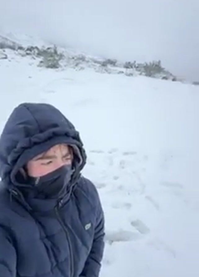 A young person wearing a dark blue puffy jacket, a black mask, and gloves stands in a snowy landscape. The person then turns and walks away, carrying a red object, possibly a plank. The camera pans across a field of snow with light vegetation, rocks, a fence, and trees in the distance. The sky is a uniform light gray, suggesting overcast conditions.