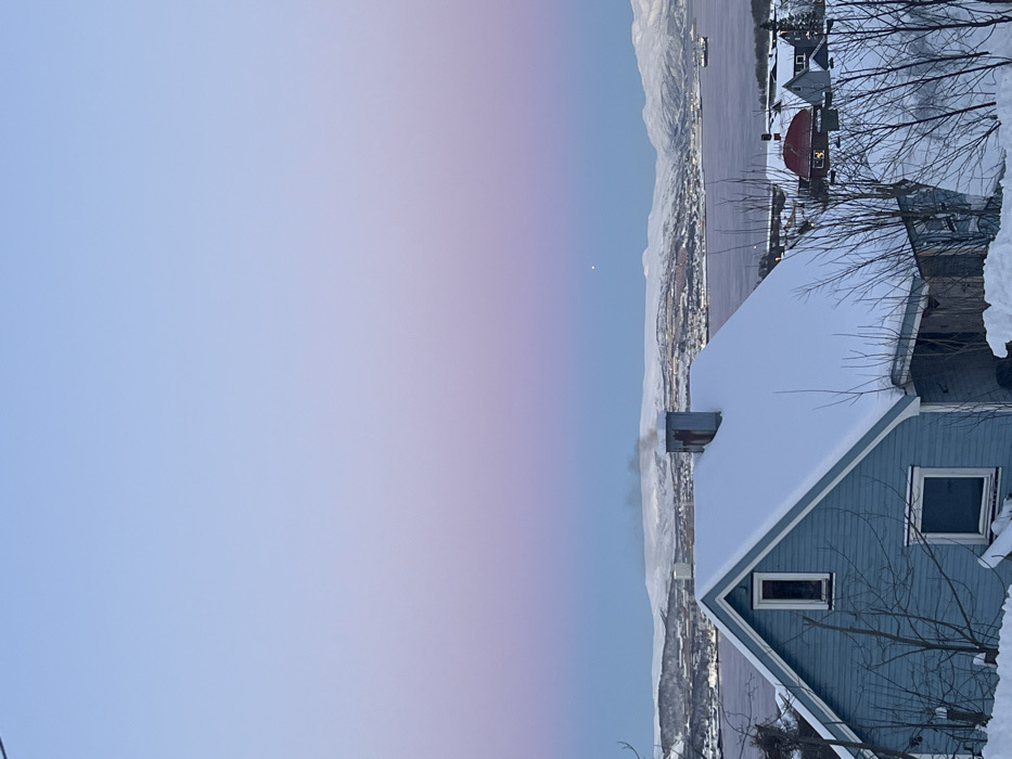 A wide-angle, static outdoor shot captures a winter scene in Tromsø, Norway, under a twilight or dawn sky. In the foreground, a two-story residential house with light blue siding and a sharply sloped, snow-covered roof occupies the lower left. A rusted metal chimney protrudes from the roof's apex, emitting a thin plume of dark smoke. Two rectangular windows are visible on the house's side facing the viewer: one centrally located on the upper story and another on the lower story, both appearing dark. Bare tree branches, partially obscured by snow, are visible in front of the house and in the immediate foreground. The midground features a body of water, likely the Tromsøysundet strait, stretching horizontally across the frame. On the far side of the water, a section of Tromsø city is visible, characterized by various buildings and discernible artificial lights. The city extends to the base of snow-covered mountains that dominate the background. Two large vessels are present on the water to the right, one with a prominent white superstructure. The sky exhibits a gradient, transitioning from a light, clear blue at the top to a pale pink and lavender hue near the horizon. A single, distinct white celestial object, likely a star or planet, is visible in the upper right portion of the pinkish sky. The overall scene indicates cold, clear winter conditions. No individuals are visible.