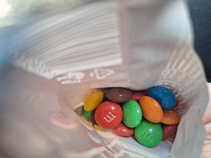 - "The image displays a close-up, top-down perspective into an opened flexible package containing numerous M&M's chocolate candies" by FM-EyRdI3, licensed under CC BY 4.0