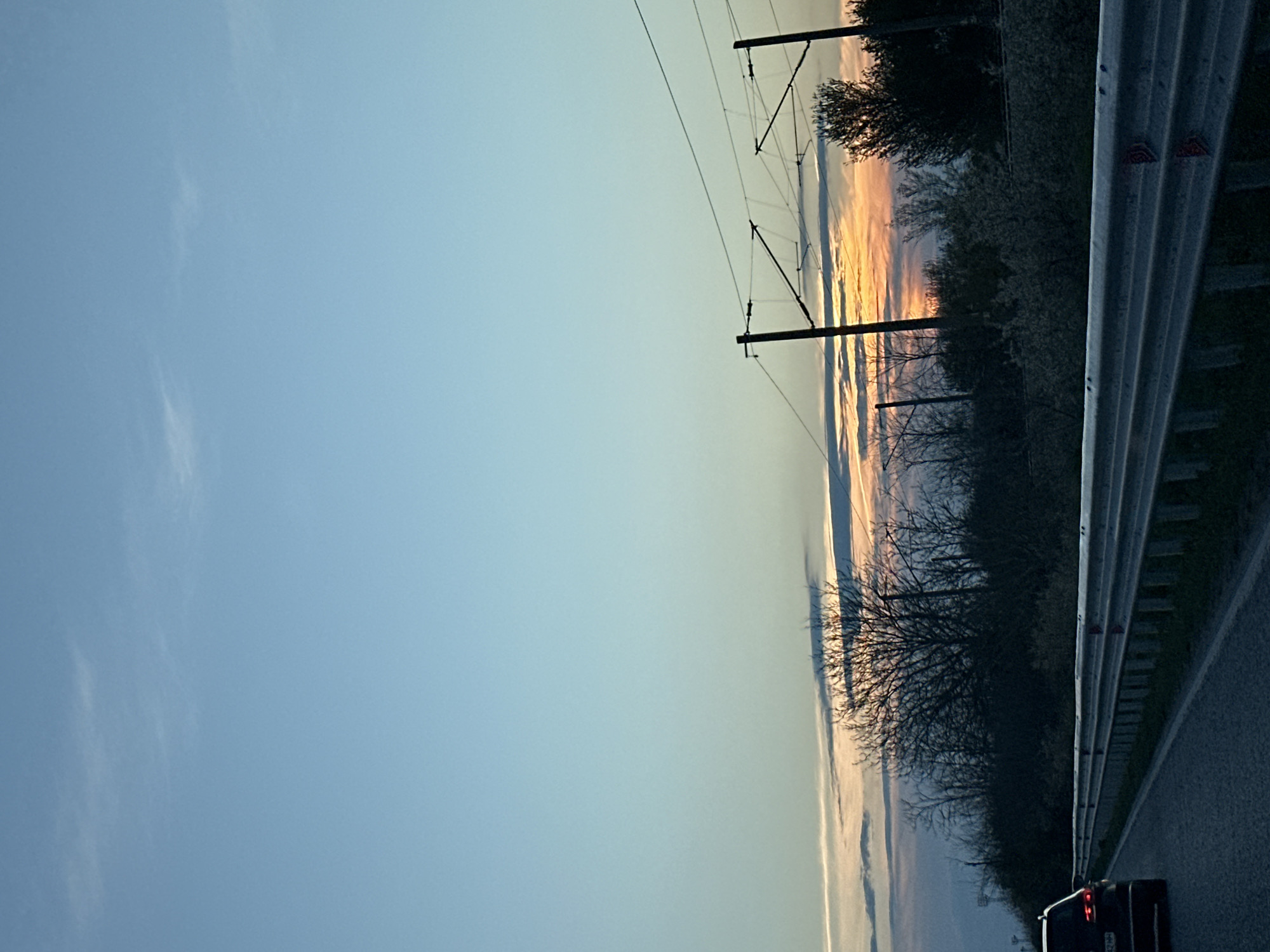 landscape at what appears to be sunset or sunrise. A clear sky is visible on the left. Overhead power lines and support structures run parallel to a road, which is bordered by a guardrail on the right. A treeline borders the far side of the road. The presence of the overhead power lines suggests the presence of a railway. A dark vehicle is visible at the bottom right corner, on the road. The location is Djulunitsa, Bulgaria is impossible to determine from the image.