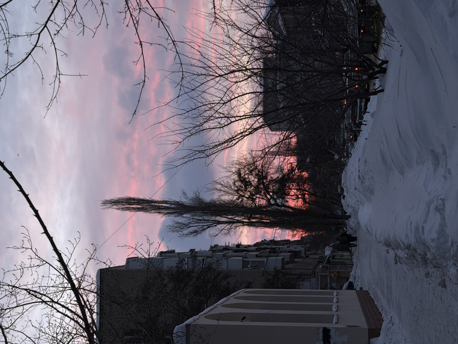 An urban winter scene shows snow-lined streets beneath a vibrant pink and purple sunset. Bare trees frame the sky, contrasting with nearby buildings and a tall, slender tree. A sidewalk cleared of snow runs along the right, suggesting a path through the winter landscape. Vehicles parked on the street add to the urban context. The composition balances natural beauty with the built environment.