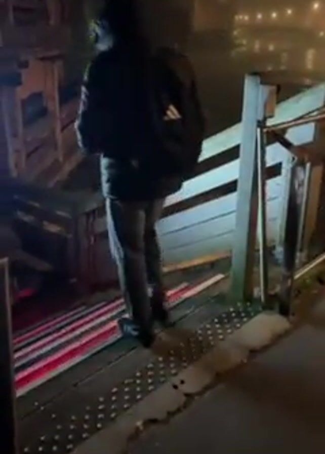 A person in a dark hooded jacket and backpack stands on a wooden platform, looking out over a body of water at night. The water is dark and choppy, with lights from buildings visible in the distance through a layer of fog or mist. The person then walks up a set of stairs with red and white stripes, leading to a lighted sign that reads "START 23H" above the word "MEET". The view then pans back to show the turbulent water and the lights in the distance.