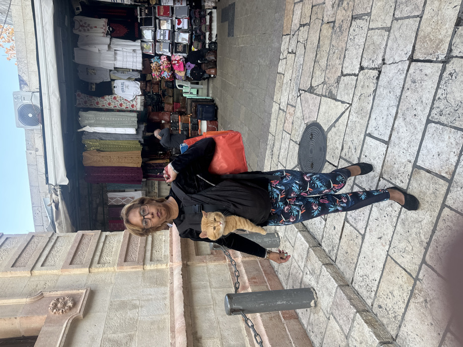 An eye-level photograph depicts a woman walking on a stone-paved market thoroughfare in Jerusalem, Israel. The woman, appearing middle-aged with reddish-brown hair and eyeglasses, is dressed in a black long-sleeved top, dark leggings patterned with blue and pink foliage, and black flat shoes. She carries an orange tabby cat in a black front-worn carrier. A red shopping bag is slung over her right shoulder, containing visible blue fabric. To the left, a light-colored stone building exhibits carved architectural details and a metal bollard with an attached chain. The background to the right features multiple open-front market stalls under a white awning, displaying various merchandise including hanging clothing, bags, and souvenirs. One displayed shirt features "ISRAEL" text. An air conditioning unit is mounted above the stalls. A male figure is partially visible within one stall. The ground is paved with irregular light-colored stone blocks, and a circular metal manhole cover is present. Natural daylight illuminates the scene.