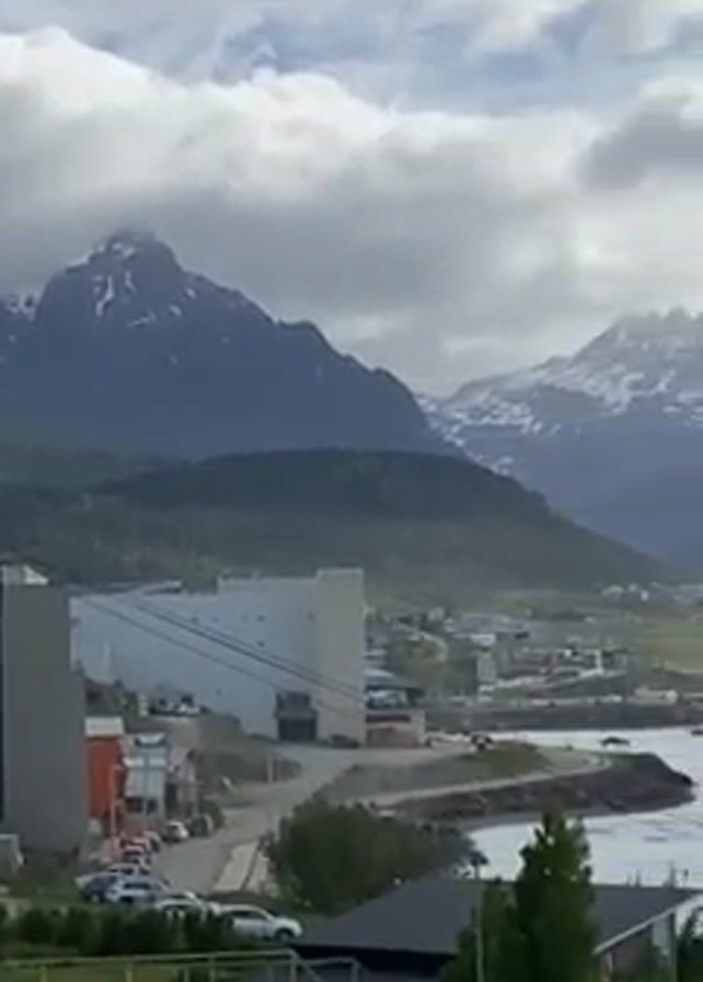 The video pans from a view of a mountain partially obscured by clouds, over a town along the coast, to a horse grazing on a grassy hill near a house. The mountain is a dark color with patches of snow, and the clouds are white and gray. The town appears to be a mixture of residential and commercial buildings. The water is calm and gray. The horse is black and white, grazing calmly. There's a car parked on the hill. The house is a simple, single-story structure with a metal roof.