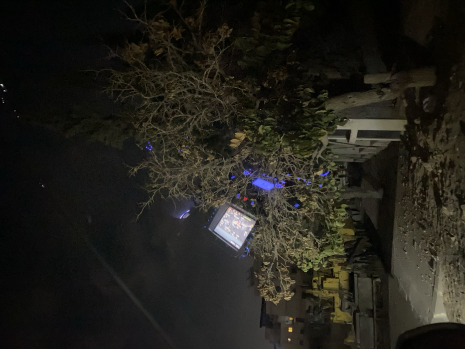 This nighttime image depicts a scene in the city of At-Tall, Syria. In the foreground, a prominent tree stands with a mix of bare branches and some green foliage. Blue LED string lights are interwoven through its branches. Suspended from one of the tree's branches is a rectangular digital display screen, angled upwards and to the left, which appears to be actively displaying an image or video content, possibly depicting a crowd or event. To the left of the tree, in the mid-ground, multiple multi-story buildings are visible in the dark background, with a few windows illuminated, suggesting residential structures. Below these buildings, a large, indistinct yellow object, possibly a piece of heavy machinery or equipment, is present. The immediate foreground consists of a rough, unpaved ground surface covered with dirt and small stones, indicative of a path or unmaintained area. No individuals are discernible in the frame. The primary light sources are the screen itself, the blue tree lights, and distant artificial illumination from the background buildings.
