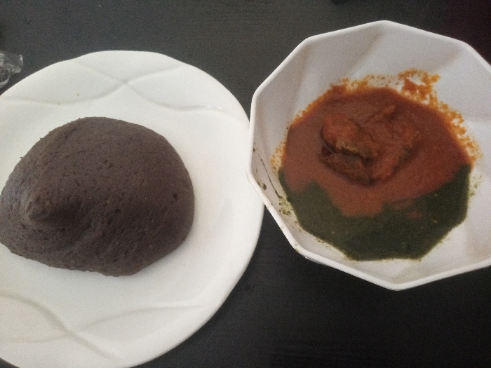 A meal is presented on a dark, flat surface within the city of Barden Yana, Nigeria