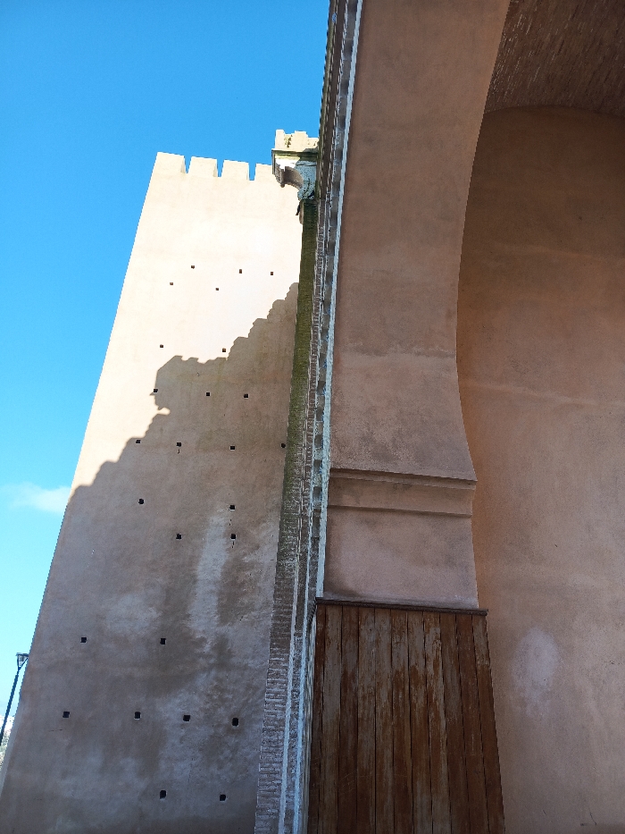 The image captures a detailed view of historical architecture in Meknes, Morocco, specifically depicting elements characteristic of the imperial city's fortifications, likely located near the Bab Mansour Lâalej gate complex or within the Dar El Makhzen royal city. The scene features two primary structures under a clear blue sky with a faint wisp of cloud on the far left. On the left, a tall, light brown-colored defensive wall, constructed from what appears to be rammed earth (pisé), extends vertically out of the frame. The top of this wall is visible with crenellated battlements. The wall's surface is dotted with numerous small, dark, square-shaped openings, consistent with scaffolding holes or decorative elements. A prominent, jagged shadow is cast diagonally across the upper-mid section of this wall from right to left. On the right, a massive, light reddish-brown archway is visible, presenting a smooth, curved inner surface that extends out of the frame both upward and to the right. Between the tall wall and the archway, a vertical architectural feature acts as an intermediary. Near its top, this feature includes a decorative cornice from which a light-colored, ornate spouted element (resembling a gargoyle or water spout) projects horizontally. Below this, a vertical strip of weathered material, possibly brickwork or stone, exhibits patches of greenish discoloration. The base of the right-hand structure transitions into a panel composed of vertical, dark brown, weathered wooden planks. No individuals or active subjects are present. The scene is brightly lit by natural sunlight, creating distinct shadows.